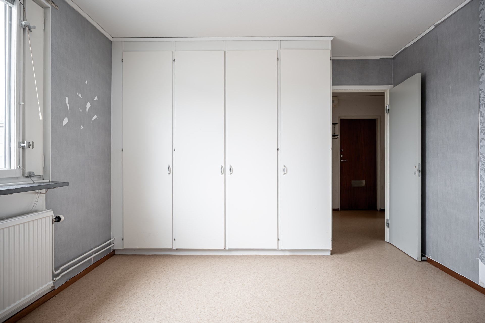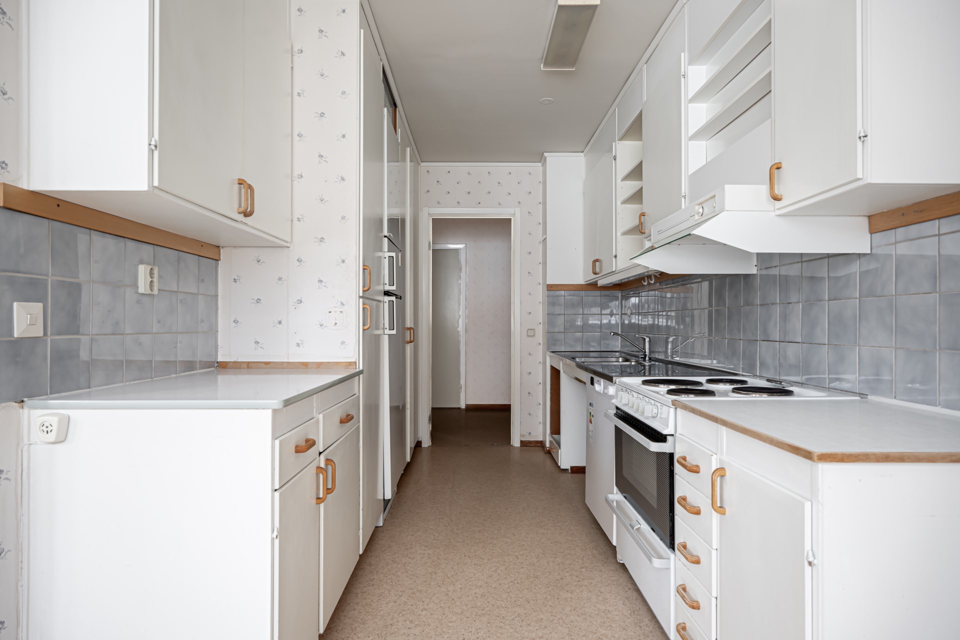 Till höger ligger badrummet och till vänster köket, där du även har utgång till den trevliga balkongen, ett perfekt extra utrymme för avkoppling och umgänge under årets varmare månader. Sovrummet är rymligt med plats för dubbelsäng, och förvaring erbjuds i fyra inbyggda garderober.